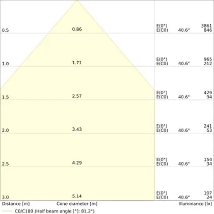 Beispiel: Wird eine Lampe mit einem Abstrahlwinkel von 60 Grad an der Decke (2,5 m Höhe) angebracht, erzeugt sie einen Lichtkegel von 2,9 Metern Durchmesser. Hat die Lampe hingegen einen Abstrahlwinkel von 120 Grad, beträgt der Lichtkegel 8,7 Meter im Durchmesser. |