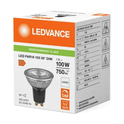 Die Ledvance LED PAR16 GU10 Reflektor 7W 750lm 36D - 840 Kaltweiß | Dimmbar - Ersatz Für 80W ist eine effiziente GU10 LED-Lampe und der perfekte Ersatz für Ihre konventionelle Halogenlampe mit 80W und einem GU10-Sockel, bei welchem die zwei Stifte einen Abstand von 10 mm zueinander haben. Zudem strahlt das Produkt Licht in der Farbtemperatur 4000K - Kaltweiß aus und punktet durch eine lange Lebensdauer.
