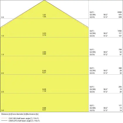 Beispiel: Wird eine Lampe mit einem Abstrahlwinkel von 60 Grad an der Decke (2,5 m Höhe) angebracht, erzeugt sie einen Lichtkegel von 2,9 Metern Durchmesser. Hat die Lampe hingegen einen Abstrahlwinkel von 120 Grad, beträgt der Lichtkegel 8,7 Meter im Durchmesser. |
