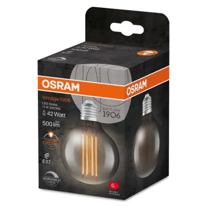Die Ledvance Vintage 1906 LED E27 Globe Smoke 11W 500lm - 818 Extra Warmweiß | Dimmbar - Ersatz für 42W ist eine effiziente E27 LED-Lampe mit Retrodesign und der perfekte Ersatz für Ihre konventionellen 42W Lampen mit E27. Zudem strahlt sie Licht in der Farbtemperatur 1800K - Extra Warmweiß aus und punktet durch eine lange Lebensdauer.