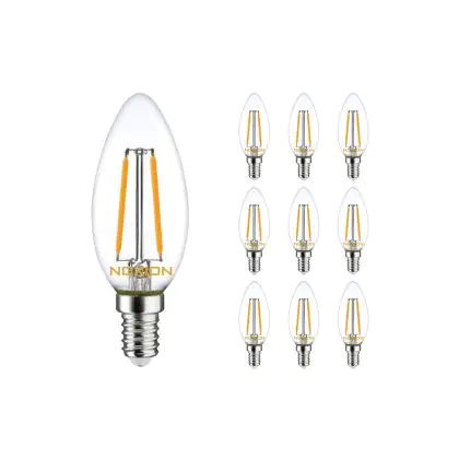 Die Mehrfachpackung 10x Noxion Lucent LED E14 Kerze Fadenlampe Klar 2.5W 250lm - 827 Extra Warmweiß | Ersatz für 25W ist eine effiziente E14 LED-Lampe mit Retrodesign und der perfekte Ersatz für Ihre konventionellen 25W Lampen mit E14. Zudem strahlt sie Licht in der Farbtemperatur 2700K - Extra Warmweiß aus und punktet durch eine lange Lebensdauer.