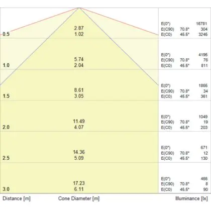 Beispiel: Wird eine Lampe mit einem Abstrahlwinkel von 60 Grad an der Decke (2,5 m Höhe) angebracht, erzeugt sie einen Lichtkegel von 2,9 Metern Durchmesser. Hat die Lampe hingegen einen Abstrahlwinkel von 120 Grad, beträgt der Lichtkegel 8,7 Meter im Durchmesser. |