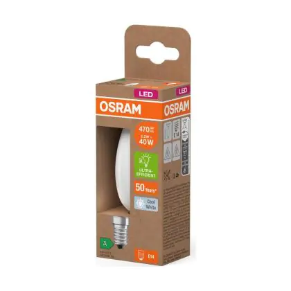 Die Osram LED Classic E14 Kerze Fadenlampe Matt 2.2W 470lm - 840 Kaltweiß | Ersatz Für 40W ist eine effiziente E14 LED-Lampe mit Retrodesign und der perfekte Ersatz für Ihre konventionellen 40W Lampen mit E14. Zudem strahlt sie Licht in der Farbtemperatur 4000K - Kaltweiß aus und punktet durch eine lange Lebensdauer.