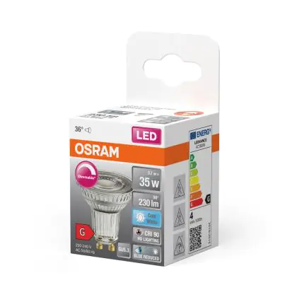 Die Osram LED Superstar Reflektor Spot GU10 PAR16 3.7W 230lm 36D - 940 Kaltweiß | Höchste Farbwiedergabe - Dimmbar - Ersatz Für 35W ist eine effiziente GU10 LED-Lampe und der perfekte Ersatz für Ihre konventionelle Halogenlampe mit 35W und einem GU10-Sockel, bei welchem die zwei Stifte einen Abstand von 10 mm zueinander haben. Zudem strahlt das Produkt Licht in der Farbtemperatur 4000K - Kaltweiß aus und punktet durch eine lange Lebensdauer.