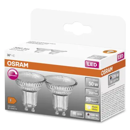 Die Osram Superstar LED GU10 Spot 4.5W 350lm - 927 Extra Warmweiß | Dimmbar - Höchste Farbwiedergabe - 2er-Set- Ersatz für 50W ist eine effiziente GU10 LED-Lampe und der perfekte Ersatz für Ihre konventionelle Halogenlampe mit 50W und einem GU10-Sockel, bei welchem die zwei Stifte einen Abstand von 10 mm zueinander haben. Zudem strahlt das Produkt Licht in der Farbtemperatur 2700K - Extra Warmweiß aus und punktet durch eine lange Lebensdauer.