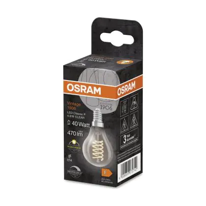 Die Osram Vintage 1906 LED Classic Slim E14 Birne Fadenlampe Klar 4.8W 470lm - 827 Extra Warmweiß | Dimmbar - Ersatz Für 40W ist eine effiziente E14 LED-Lampe mit Retrodesign und der perfekte Ersatz für Ihre konventionellen 40W Lampen mit E14. Zudem strahlt sie Licht in der Farbtemperatur 2700K - Extra Warmweiß aus und punktet durch eine lange Lebensdauer.