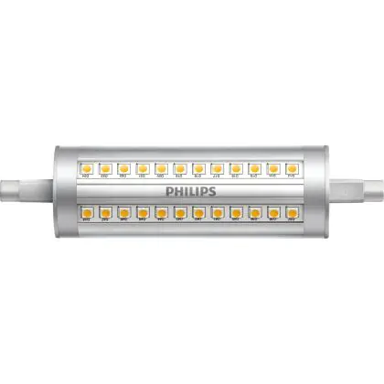 Die Philips CorePro LEDlinear R7s 14W 840 118mm | Dimmbar ist der perfekte Ersatz für konventionelle, beidseitig gesockelte R7s-Lampen mit 120 W. Das Licht steht dem traditioneller Halogenlampen in nichts nach und kann sogar gedimmt werden. Dabei sorgt der geringe Stromverbrauch für erhebliche Energiekosteneinsparungen.