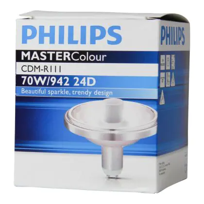 CDM-R111 Lampen sind Kompaktentladungslampen mit einem großen Reflektor. Sie haben eine sehr hohe Lichtausbeute. Die Philips CDM-R111 70W 942 GX8.5 24D (MASTERColour) besitzt einen GX8.5 Gasentladungslampensockel. Diese Lampen sind nicht dimmbar.